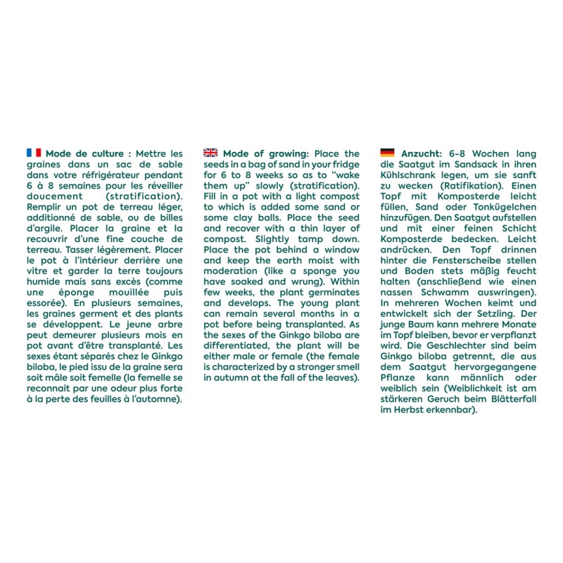 - A unique tree: Ginkgo biloba is a unique tree with fan-shaped leaves and a long history dating back over 200 million years. The seeds of this tree are difficult to find in the trade, but our bag of multilanguage seeds assembled locally in Angers allows you to grow this original tree at home.