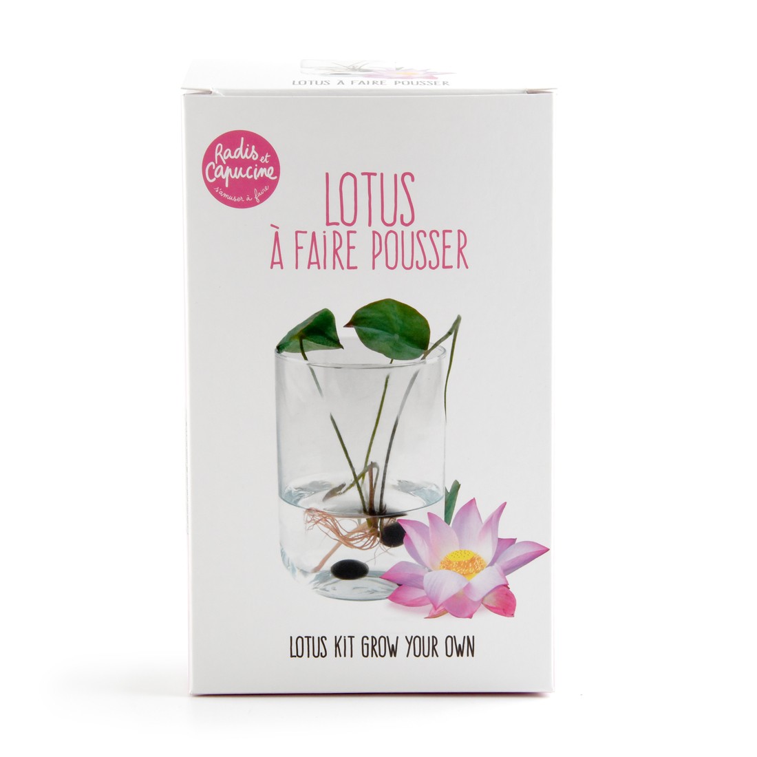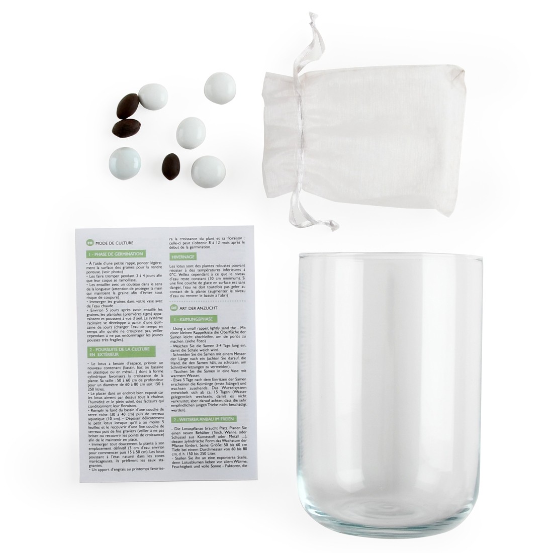Culture de Lotus rose intérieur. Cultivez chez vous un authentique Lotus asiatique dans un superbe vase pour faire germer les graines de lotus. Les graines vont germer dans l'eau et le spectacle sera zen et reposant. Ce coffret contient un vase en verre et des billes de verre décoratives. Cadeau zen, plante décorative intérieur, livré avec des graines de lotus germinatives. Assemblé à Angers, Instructions de culture et d'entretien lotus incluses en anglais, allemand, italien et espagnol.