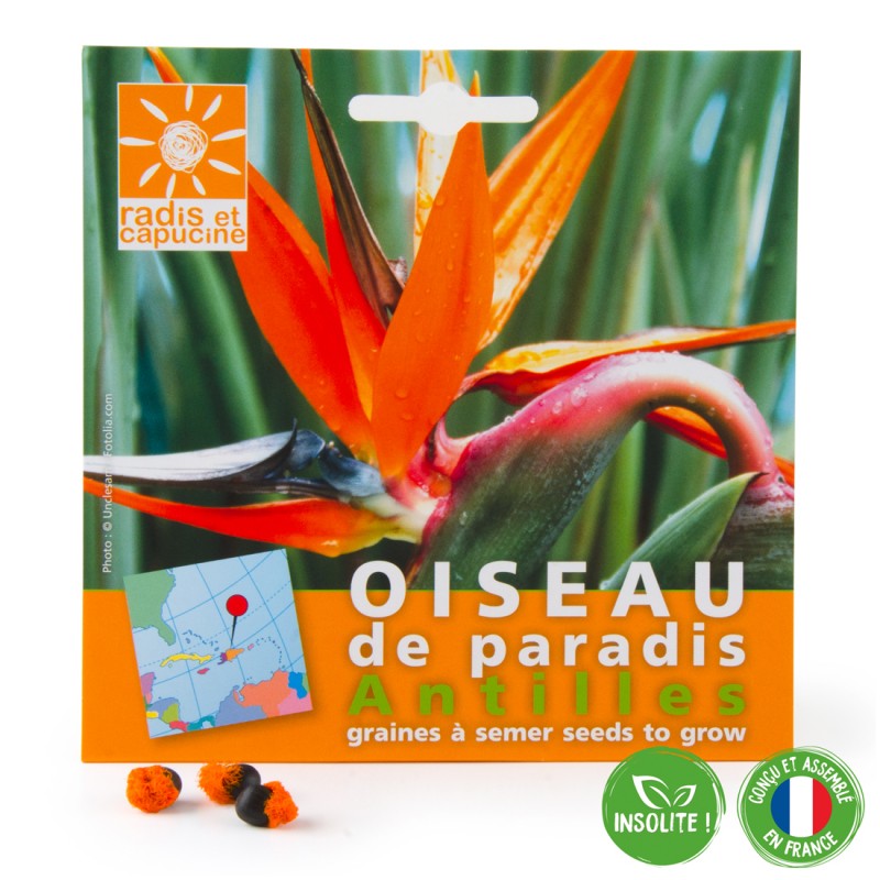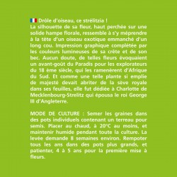 Exotic flower to sow: Strelitzia seeds from the Caribbean, or bird of paradise, to grow in a pot at home. A Caribbean flower, the bird of paradise is a stunning indoor decorative plant that grows in a pot and produces beautiful flowers. Germinating Strelitzia reginae seeds with instructions in English, German, Italian, and Spanish.