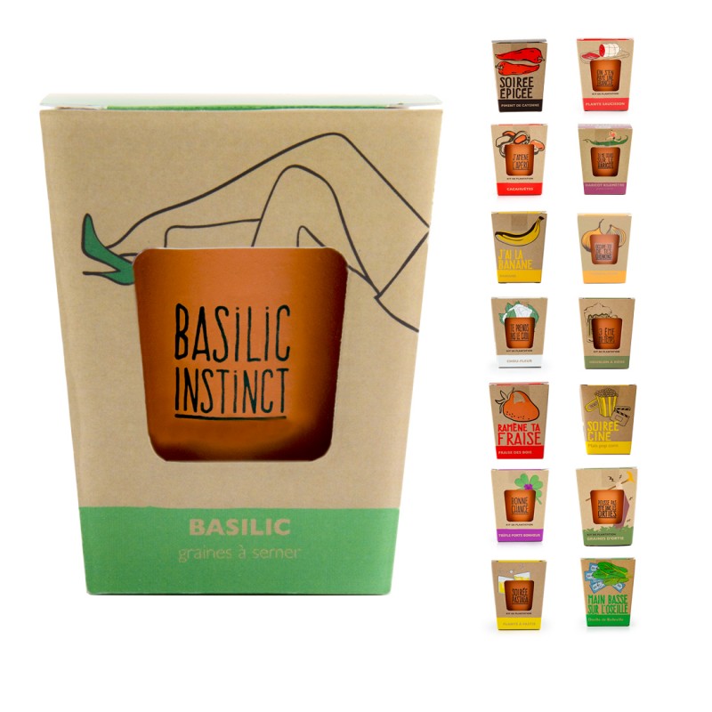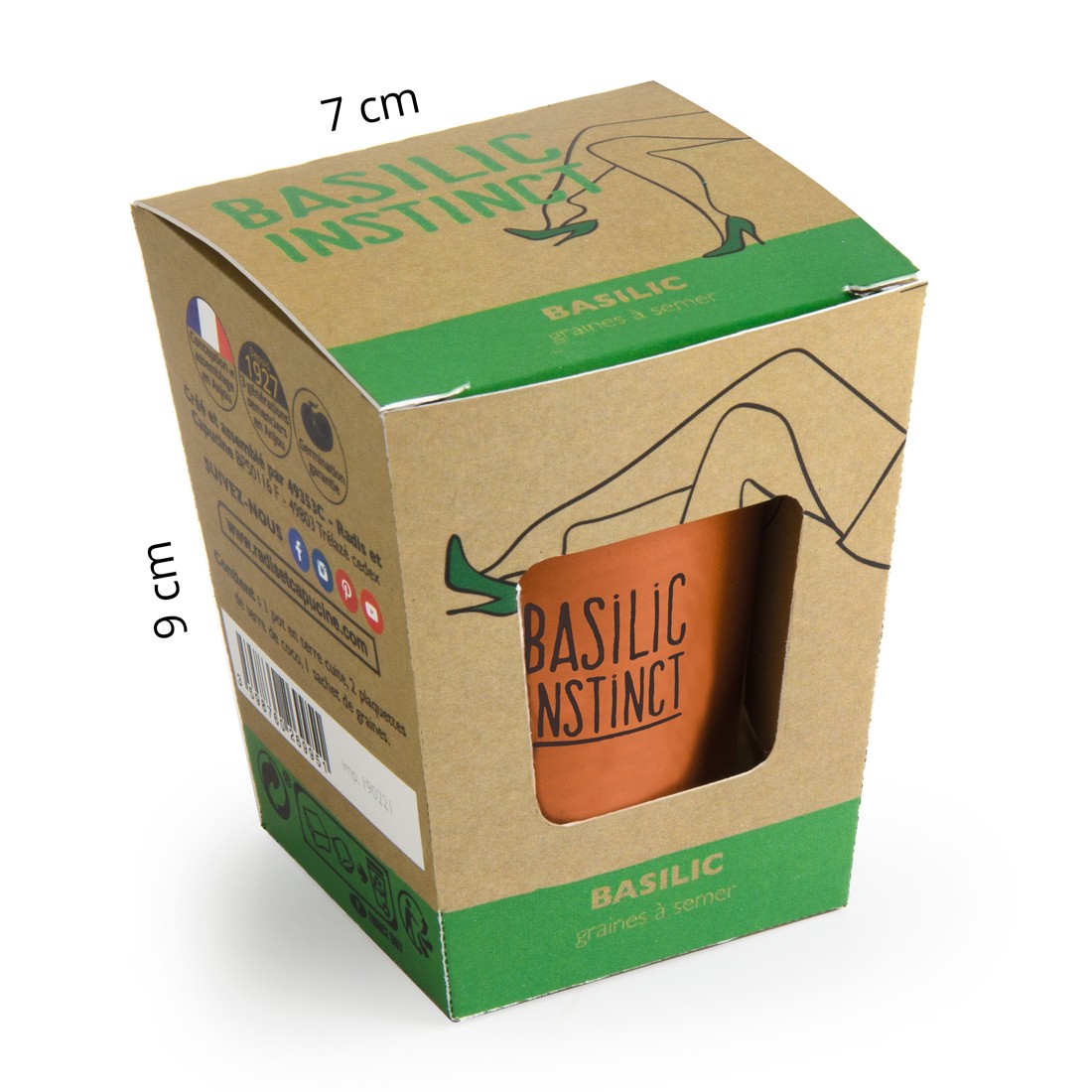 Culture kit for movie lovers with the message "Basic Instinct," to grow basil at home. Pop culture is making a comeback, and everyone remembers Sharon Stone in the movie Basic Instinct. With humor, you can give those you love a growing pot with basil seeds to grow. Gift idea for a friend and an affordable gift with seeds included. Message and texts in French.