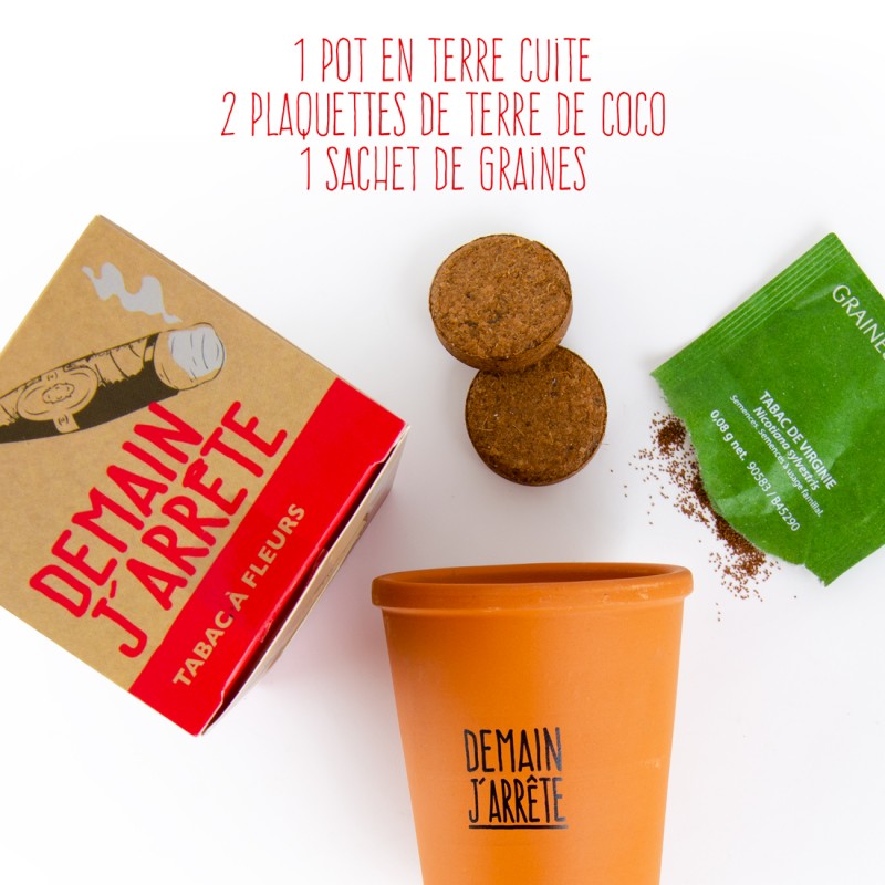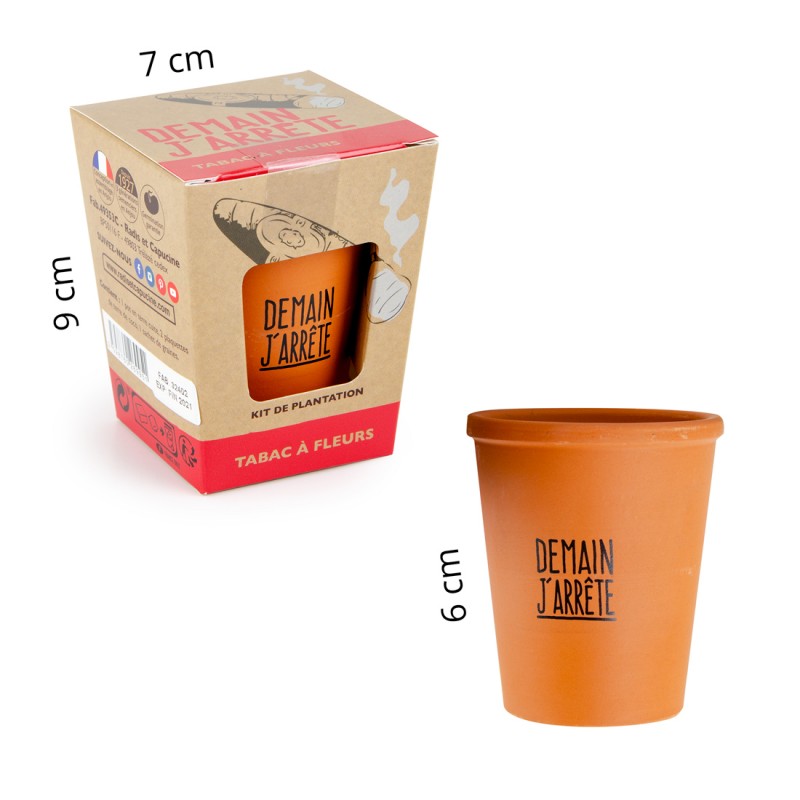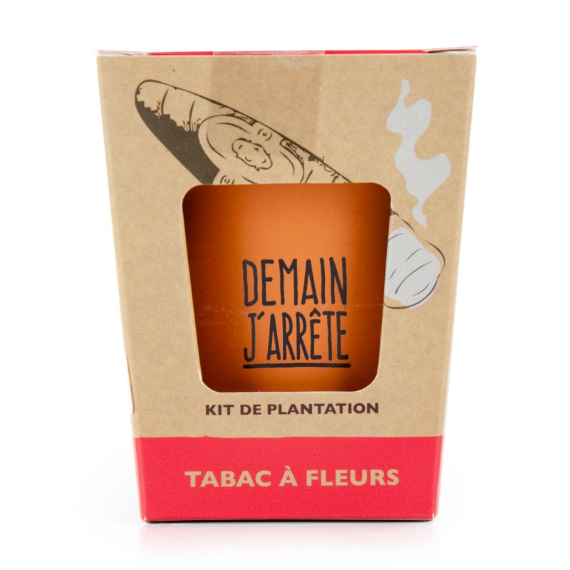Kit de plantation avec message «Demain J'arrête» pour faire pousser du Tabac de virginie, arreter de fumer et passer de la cigarette au jardinage. Offrez un cadeau pour aider les fumeurs que vous aimez à se passer de cigarette en passant au jardinage ! Le jardinage c'est mieux que la cigarette non ? Et comme on a toujours une connaissance qui a du mal à décrocher du tabac, rien de tel pour la réconforter que de lui offrir ce petit kit avec humour. Idee cadeau amis, cadeau pas cher avec graines incluses.