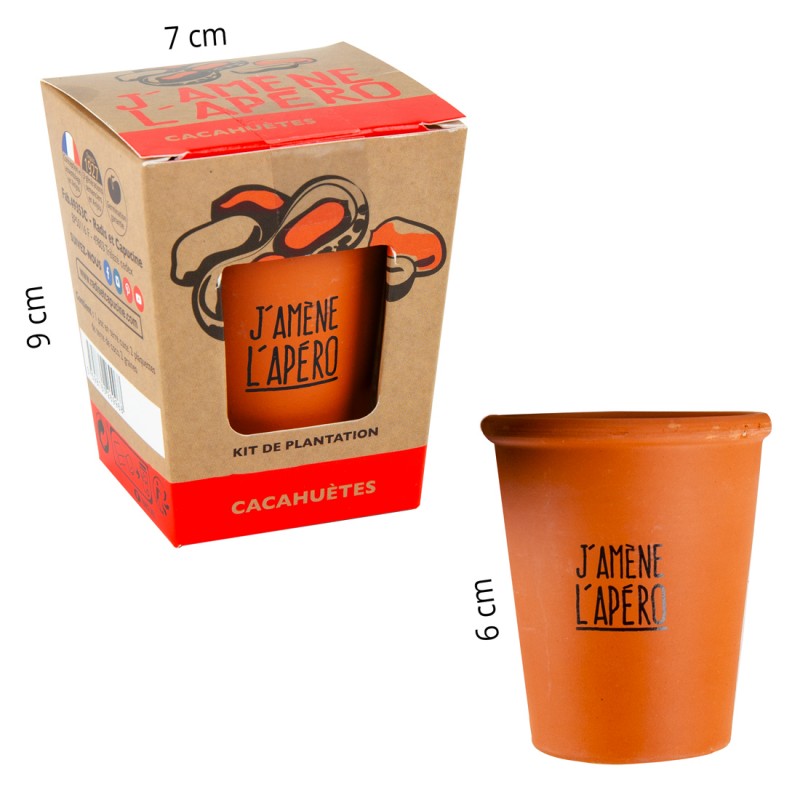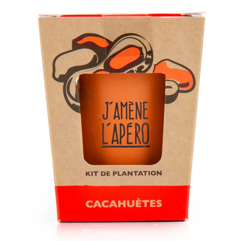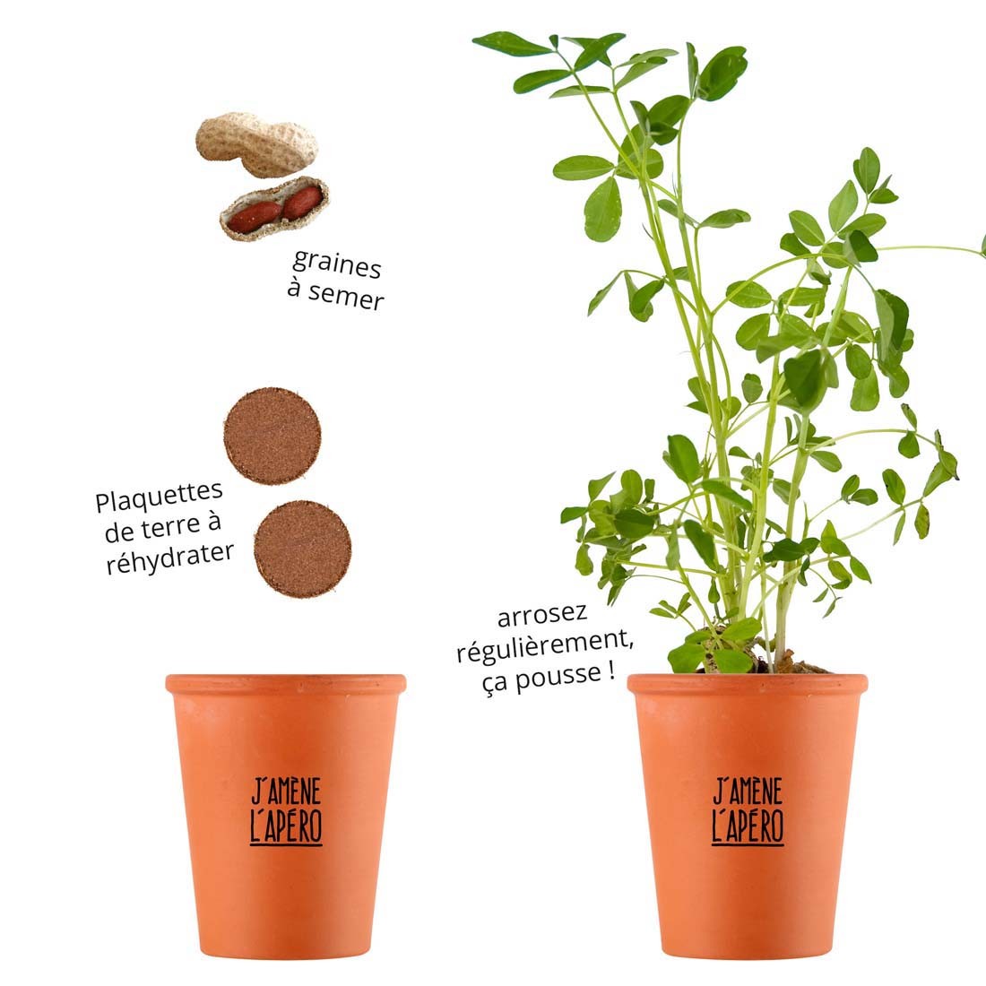 Growing kit for aperitif lovers with the message "J'amène l'apéro," to grow peanuts at home and make salted peanuts. Peanuts are an essential snack for any aperitif and grow easily in our gardens or in pots. Aperitif gift idea, planting seed kit with seeds included. Message and texts in French.