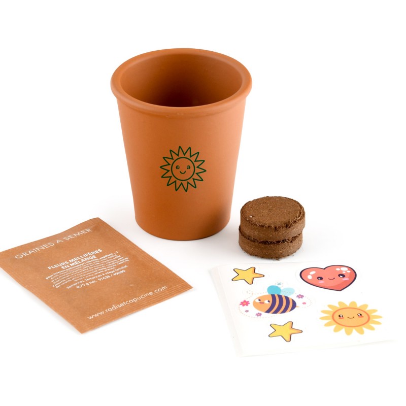 Conçu pour initier les enfants au jardinage de manière ludique et responsable, ce kit contient tout le nécessaire pour débuter : un pot, de la terre de coco à réhydrater, et un sachet de graines spécialement sélectionnées pour attirer les abeilles. Il suffit de semer, d’arroser, et d’observer la vie s'épanouir autour des fleurs.