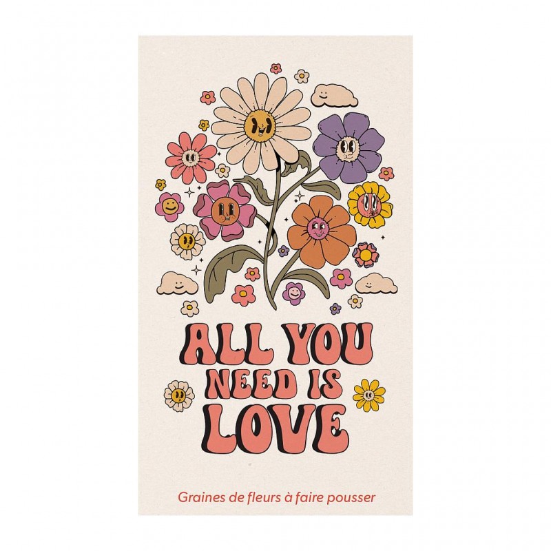 Un sachet de graines fleuries accompagné du message « All you need is Love ». Offrez un geste poétique et coloré qui fait pousser l’amour et la nature.