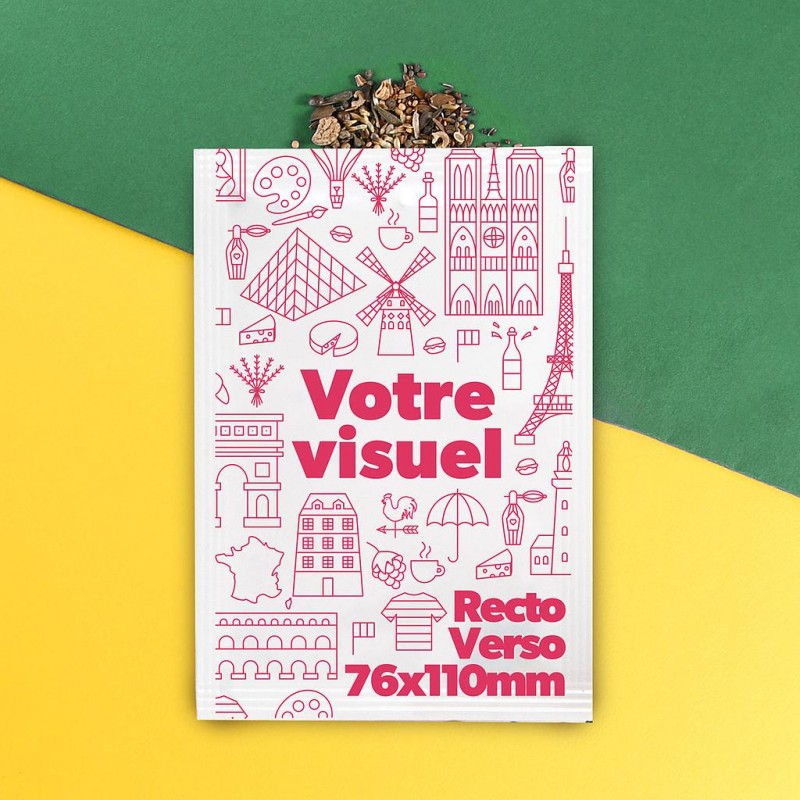 Sachet thermosoudé, personnalisation recto verso avec 4 mm de blanc tout autour, avec graines au choix