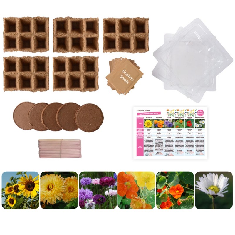 Profitez de notre lot de 30 sachets à semer et faites fleurir dans des pots de culture, des bacs, des jardinières ou votre jardin des graines bio de tournesol, des graines de capucine naine et grimpante, des graines de pâquerette et des graines bio de bleuet.