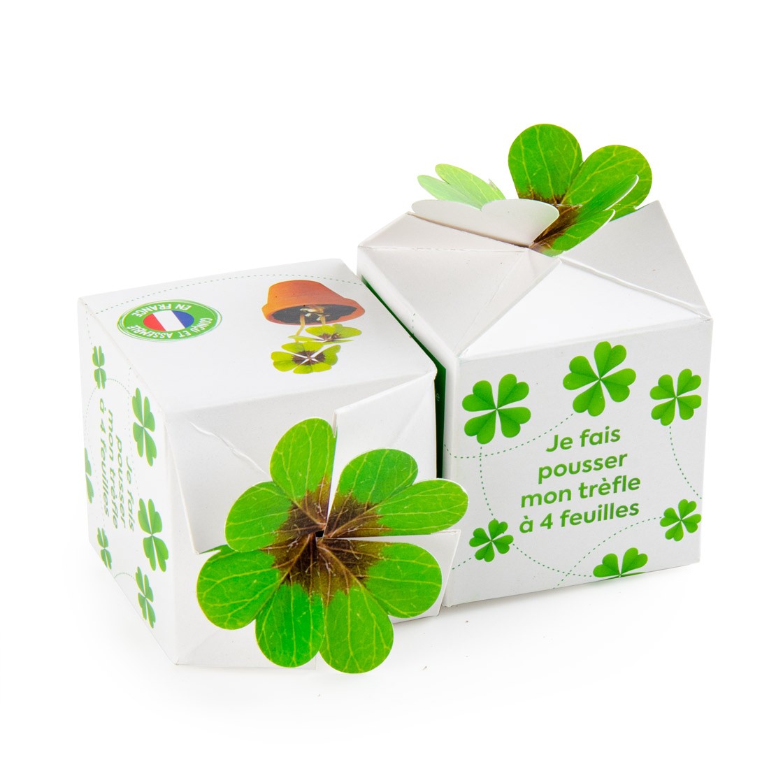 Le kit de plantation avec sa découpe en trèfle à quatre feuilles est le choix indiscutable pour offrir un message positif et mémorable. Ce support malin, dont le packaging laisse deviner son contenu à travers une fenêtre symbolique, transforme un objet publicitaire en un véritable vœu de réussite.