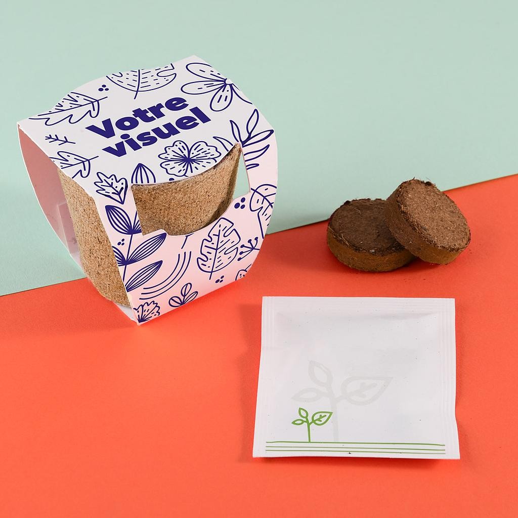 Le kit avec pot biodégradable est l'objet publicitaire par excellence pour les entreprises qui souhaitent une cohérence parfaite entre leur message et leur support. Contrairement aux pots en plastique, celui-ci peut être mis en terre directement une fois que la plante a grandi, évitant ainsi tout déchet.