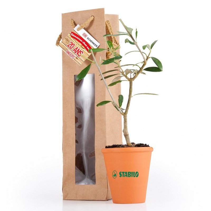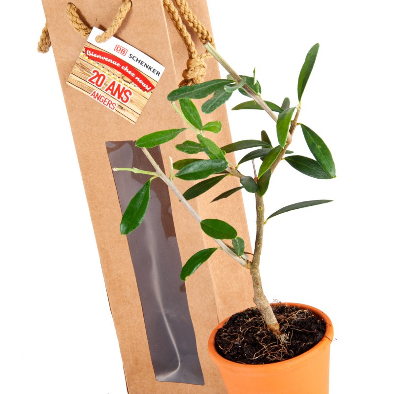 Un petit plant d'Olivier dans son cache pot en terre cuite forme inséré dans un sac kraft avec 2 anses