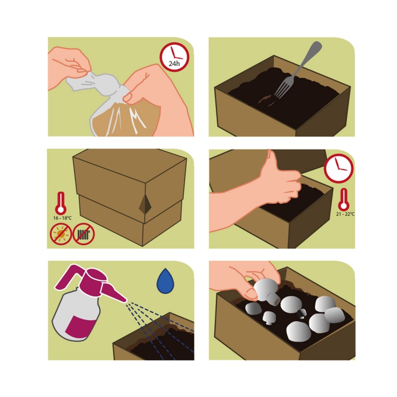 Faire des ouvertures dans le sac de culture, gratter la paille ensemencée pour apporter de l'oxygène au mycélium et arroser avec un pulvérisateur. Maintenez une température stable entre 15 et 20 °C et une humidité élevée. Le nameko préfère des conditions fraîches et humides et est sensible à la température. Une faible lumière indirecte peut aider à stimuler la croissance des champignons. Conservation du kit Ce kit de culture est sensible aux changements de températures et il est préférable de conserver les kits de champignons dans une pièce fraiche ou au frigo si vous voulez l'offrir à Noël. Hors frigo, à utiliser sous 2 à 3 semaines.