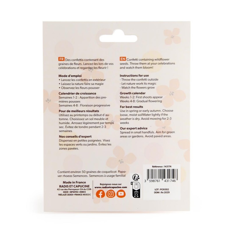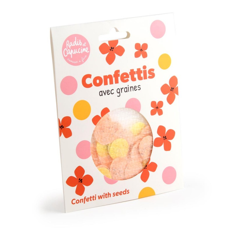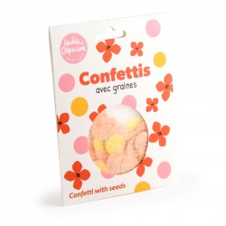 Pochette de confettis, fabriqués en papier biodégradable contenant des graines de fleurs en mélange : lancez-les pendant une fête ou un événement, puis semez-les pour voir éclore de jolies graines de fleurs. Une pluie de couleurs… qui continue de fleurir après la fête !