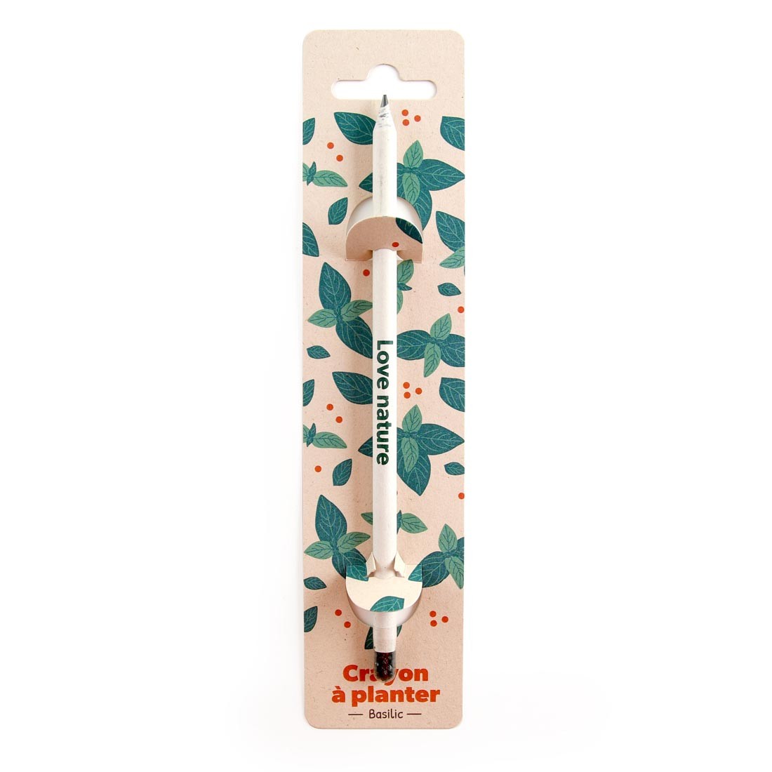 Crayon à papier avec capsule de graines de basilic vert à l’extrémité. Une fois utilisé, plantez le crayon en terre : la capsule biodégradable se dégrade et le basilic pousse. Présenté en cavalier brochable, idéal comme cadeau écologique et aromatique.