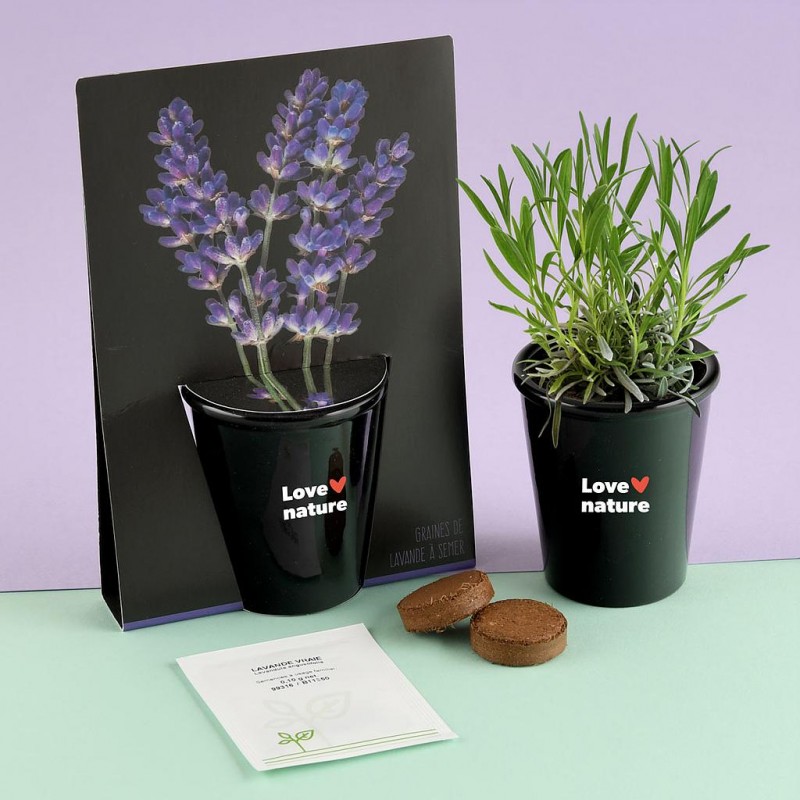 Kit de plantation avec terre et graines pour faire pousser une lavande en pot.
