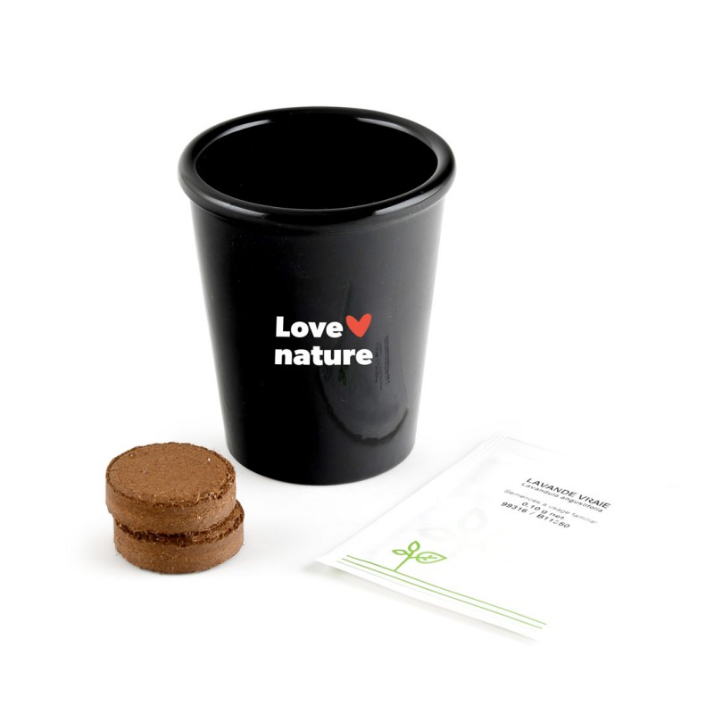 • 1 pot noir, diam 6 cm avec marquage "Love nature"