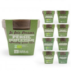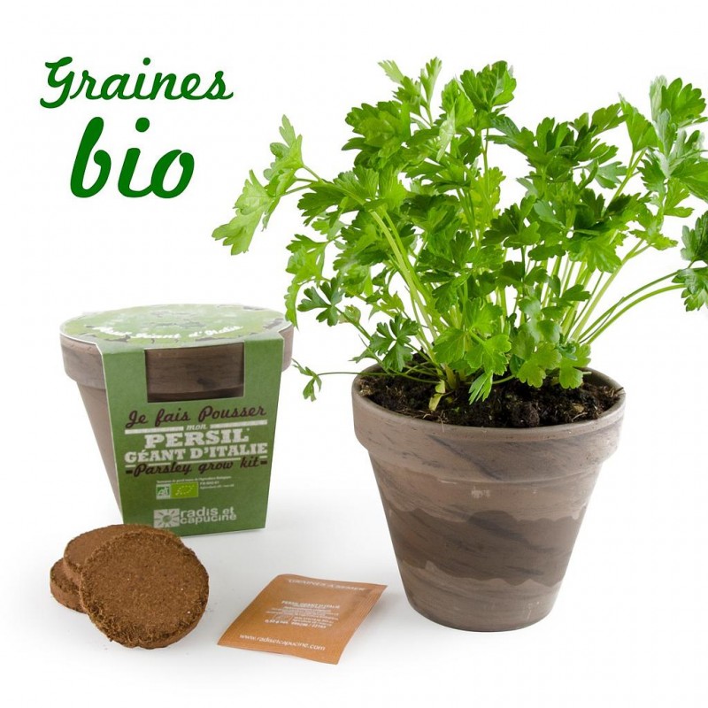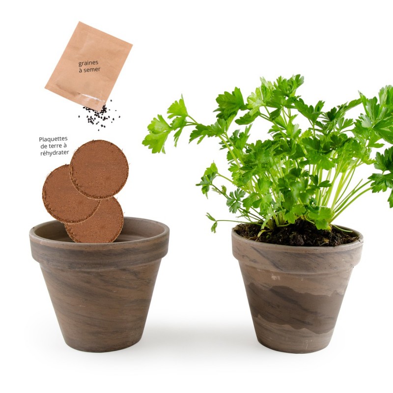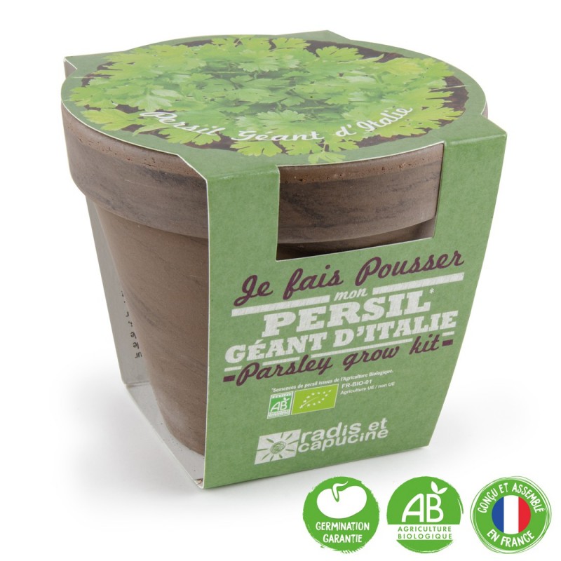 Kit graines à planter pour faire pousser un plant de Persil et obtenir un délicieux Persil italien en pot..Dans son pot basalte, le plant d'herbe aromatique qu'on a fait pousser fournit toute l'année, dans sa cuisine, et pendant de longs mois si on décide de le cultiver en extérieur.Voilà une culture aromatique riche pour les débutants. Idée cadeau jardinage, pot de culture livré avec des graines de Persil italien biologiques reproductibles. Instructions de culture en anglais, allemand, italien et espagnol.