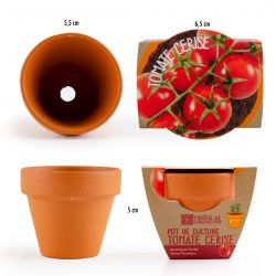 Petit pot de culture en terre cuite pour faire pousser à la maison des graines de Tomate Cerise apero bio.