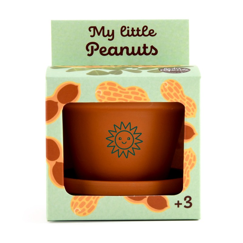 Kit de jardinage pour enfants : semer ses graines cacahuète en pot. Les cacahuètes sont particulièrement adaptées aux enfants car leur culture est rapide et facile. On commence dans le petit pot et on replante dans son jardin ou dans un pot plus grand. Idée cadeau enfant, cadeau pas cher, assemblé en France, avec graines de cacahuete reproductibles et germinatives. Instructions en anglais, allemand, italien et espagnol.