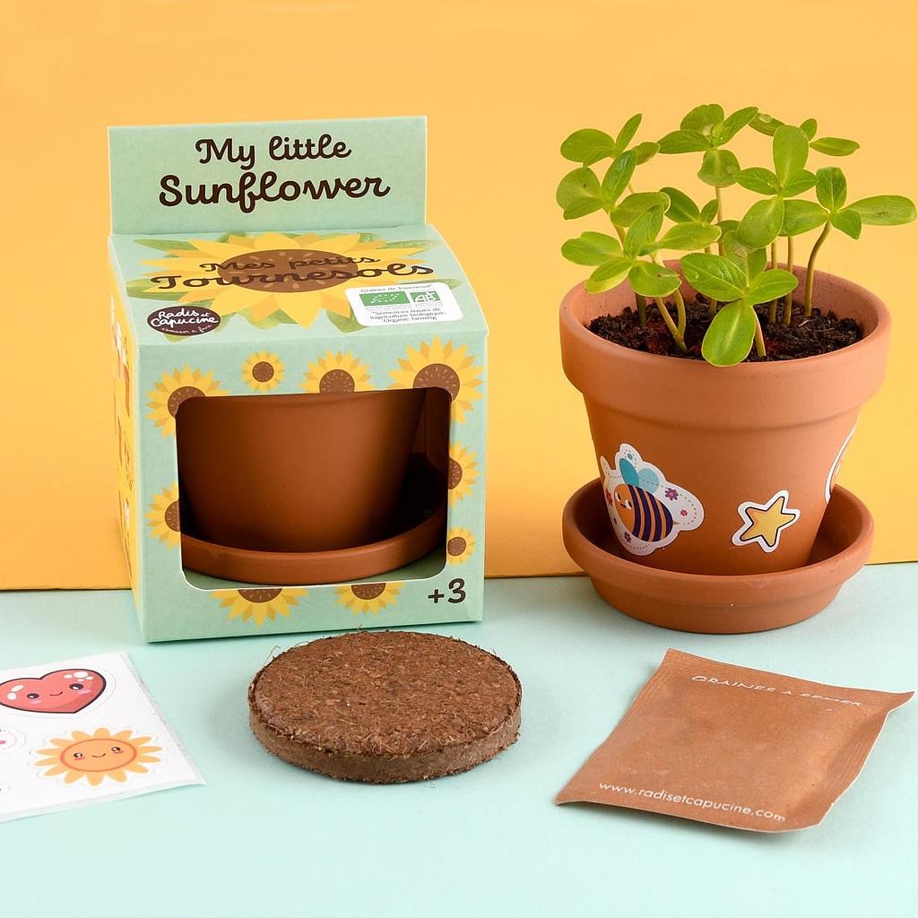 Kit de jardinage pour enfants : semer ses Tournesols. Optez pour notre kit de plantation avec des graines de tournesol bio pour une expérience éducative et enrichissante. Cultivez vos propres tournesols à la maison, en toute simplicité. Un geste concret pour votre bien-être et celui de la planète ! Rien de plus facile, et c'est une belle occasion d'initier les enfants au jardinage. Les graines de tournesol sont de qualité, certifiées biologiques.