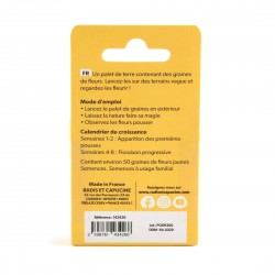 Transformez les espaces urbains délaissés en coins fleuris grâce à cette plaquette déshydratée de terre de coco recyclée et fertilisée, sur laquelle sont collées à la main en France des graines de fleurs jaunes en mélange. Présentée dans une boîte brochable, cette plaquette est conçue pour être lancée au-dessus des grillages, terrains vagues ou zones inaccessibles.