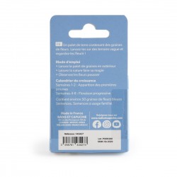 La terre de coco, une fois humidifiée, crée un environnement favorable à la germination des graines, qui donneront naissance à une floraison bleue intense et naturelle. Présentée dans une boîte brochable, cette plaquette est idéale comme cadeau original ou outil de sensibilisation à la végétalisation urbaine.