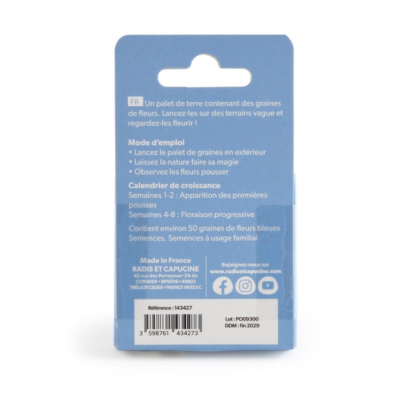 Plaquette en terre de coco fertilisée avec graines de fleurs bleues fixées à la main en France. À lancer dans les terrains vagues ou zones inaccessibles : la pluie active la germination. Présentée en boîte brochable, pour végétaliser les espaces oubliés avec style.