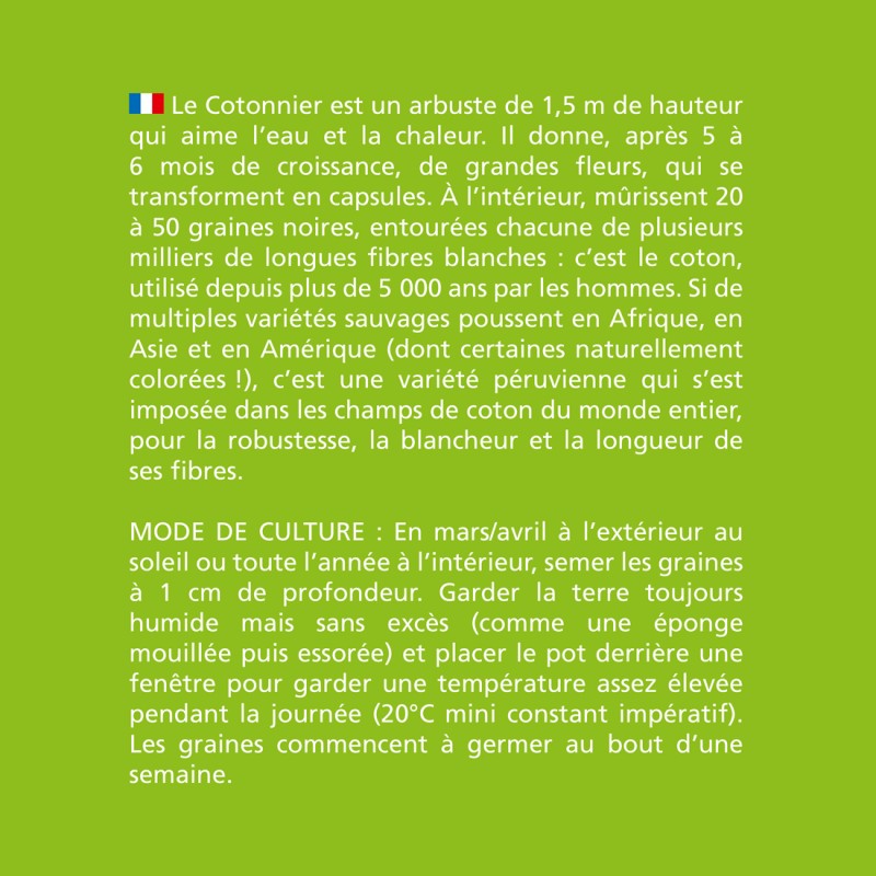 Plante exotique à semer : Cotonnier de Louisiane à semer à la maison en plante en pot pour voir fleurir la fleur de coton dans votre véranda. D'où vient le coton de votre tee shirt ? Du cotonnier ! La graine de coton est facile à semer à l'intérieur et pousse dans nos jardins ensoleillés. Graines germinatives de Cotonnier avec instructions en anglais, allemand, italien et Espagnol.